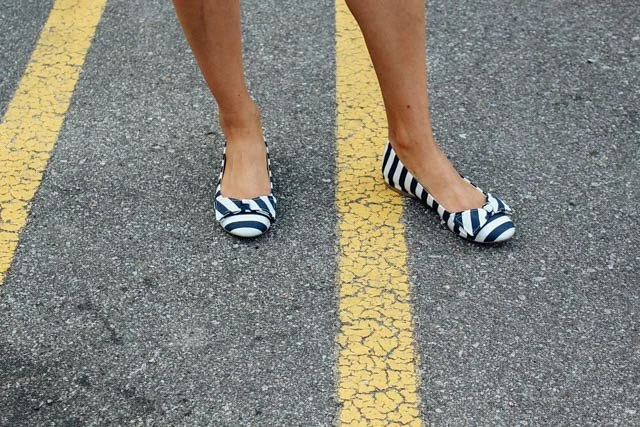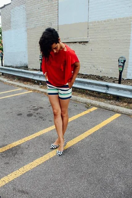 Give your look a nautical flair with a pair of striped shorts. If you're feeling bold, add a striped bag or pair of shoes. If you do, keep it simple on top. We love this red, mock-linen top from Banana Republic--it's lightweight and adds an interesting textural element.
